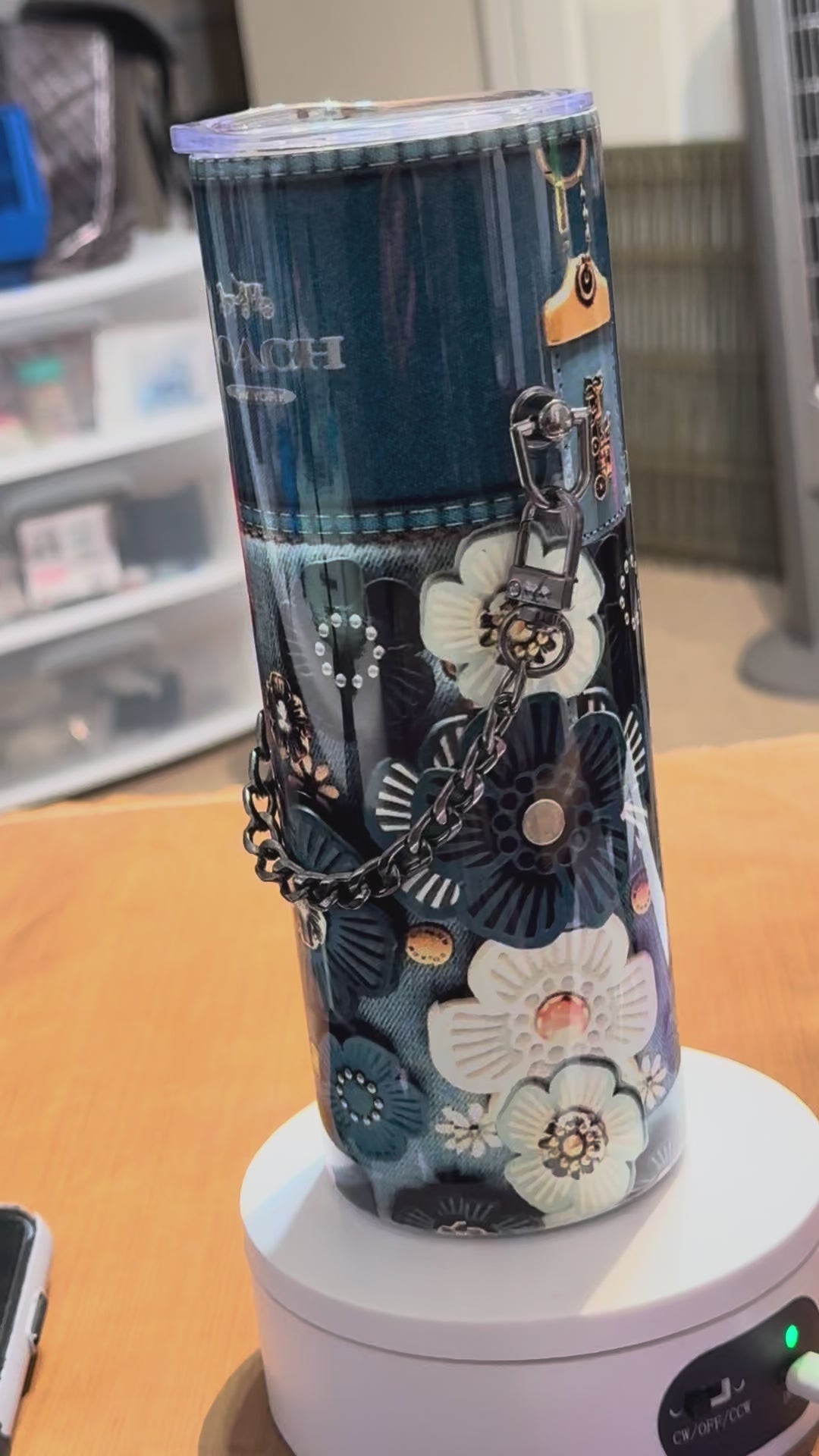 Upgrade your daily caffeine fix with our Coach inspired 20oz tumbler featuring a sleek chain detail. Keep your drinks at the perfect temperature while making a stylish statement. Luxurious and practical, this tumbler is perfect for the fashion-forward coffee lover.