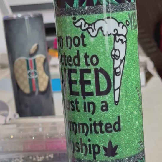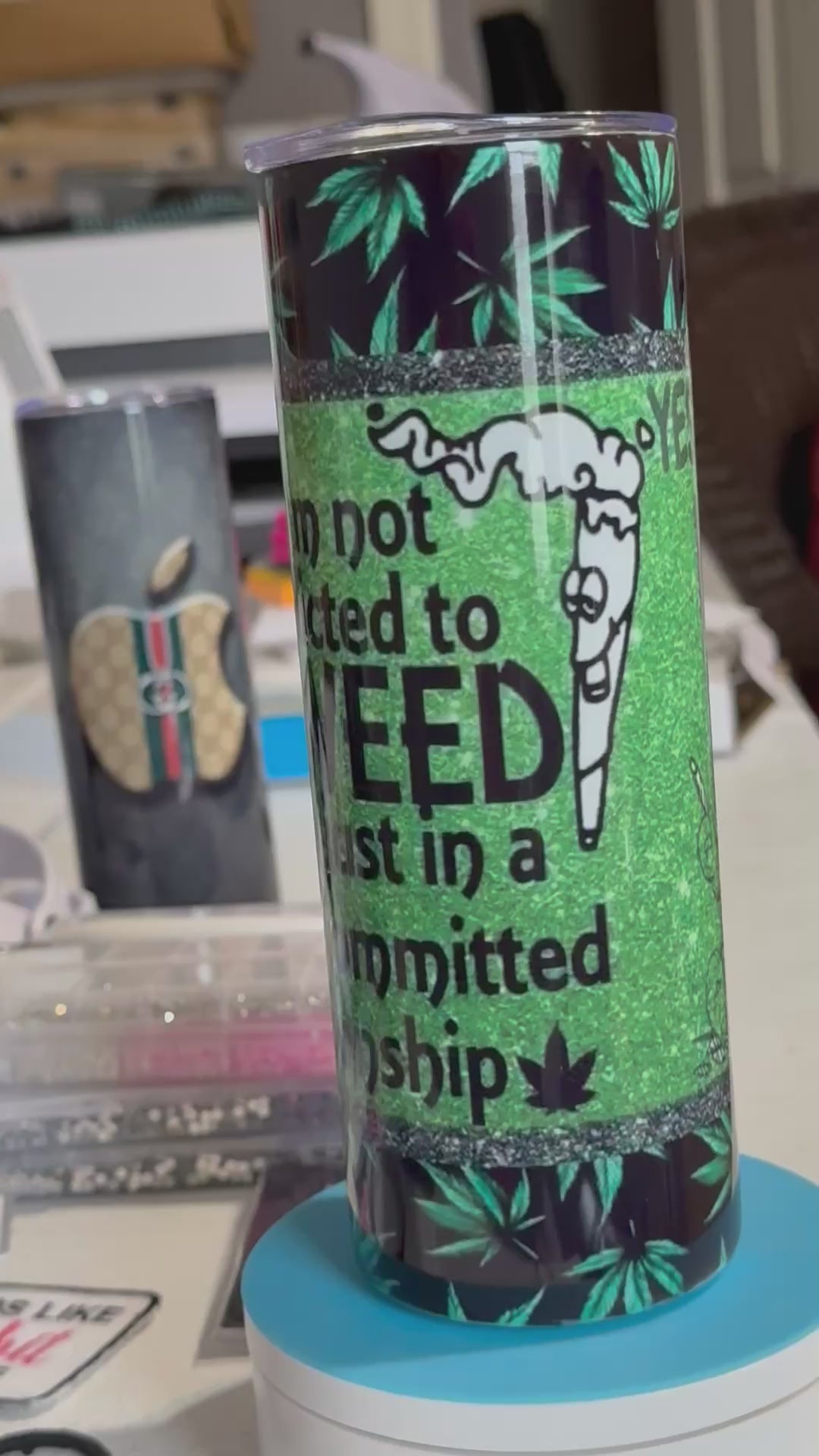 "Stay hydrated (and honest) with our Im Not Addicted to Weed 20oz tumbler! Keep your drinks at the perfect temperature while making a statement. Whether you're a fan of word play or just want to show some lighthearted humor, this tumbler is for you. Cheers (without judgment)!"