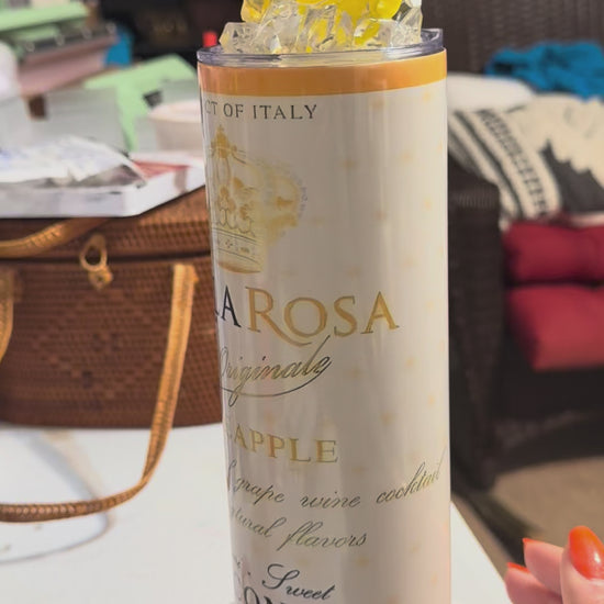 Introducing the Stella Rosa Pineapple 20oz tumbler, with a luxurious 3D topper. Keep your drink stylishly chilled with this exclusive tumbler, featuring the refreshing flavors of Stella Rosa Pineapple. Perfect for any occasion, this tumbler is a sophisticated accessory that will elevate your drinking experience.