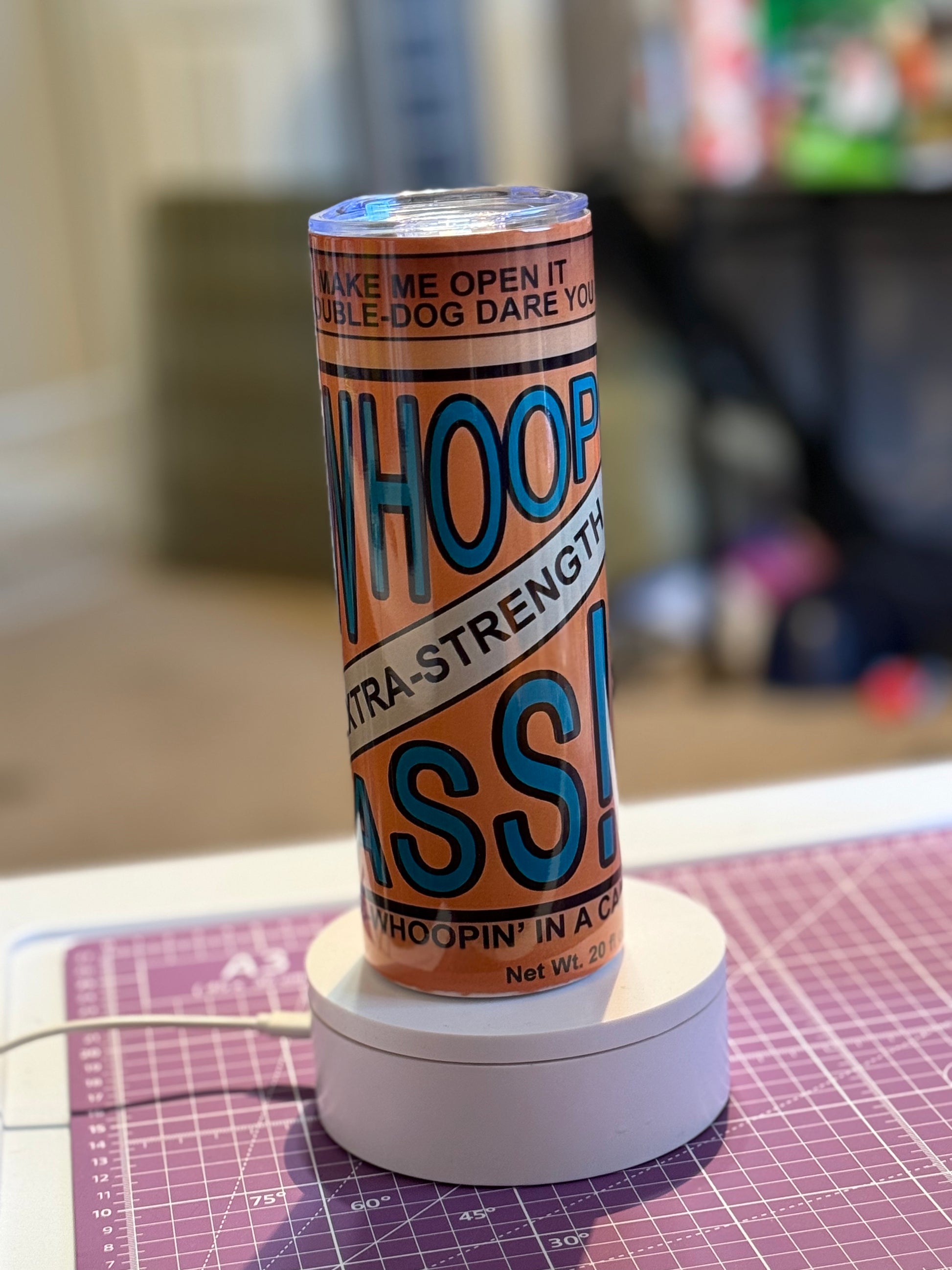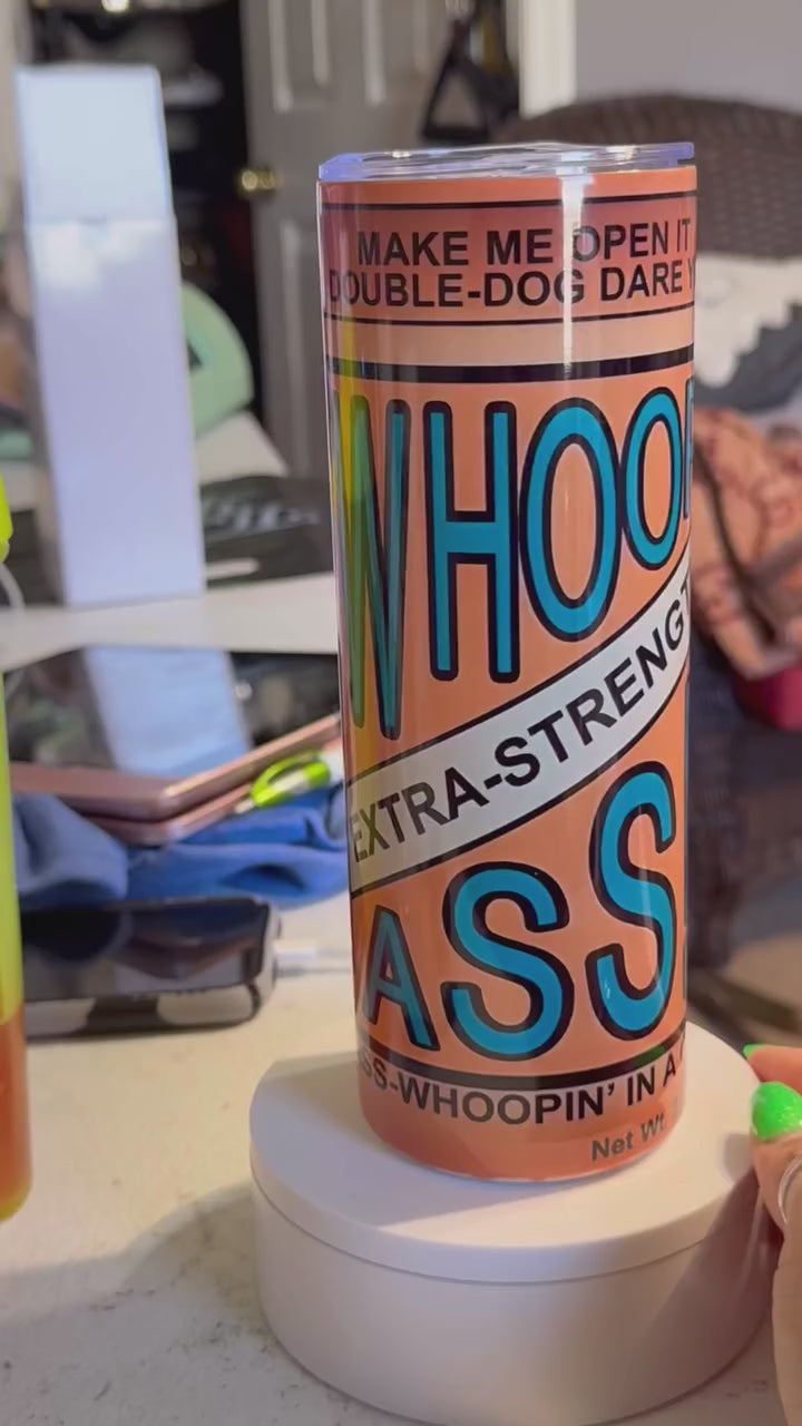 The Whoop A** tumbler is the perfect way to show off your playful and quirky side. This tumbler literally kicks butt and keeps your drinks hot or cold. Take it on-the-go and be prepared to whoop some ass (or just enjoy a refreshing beverage).
